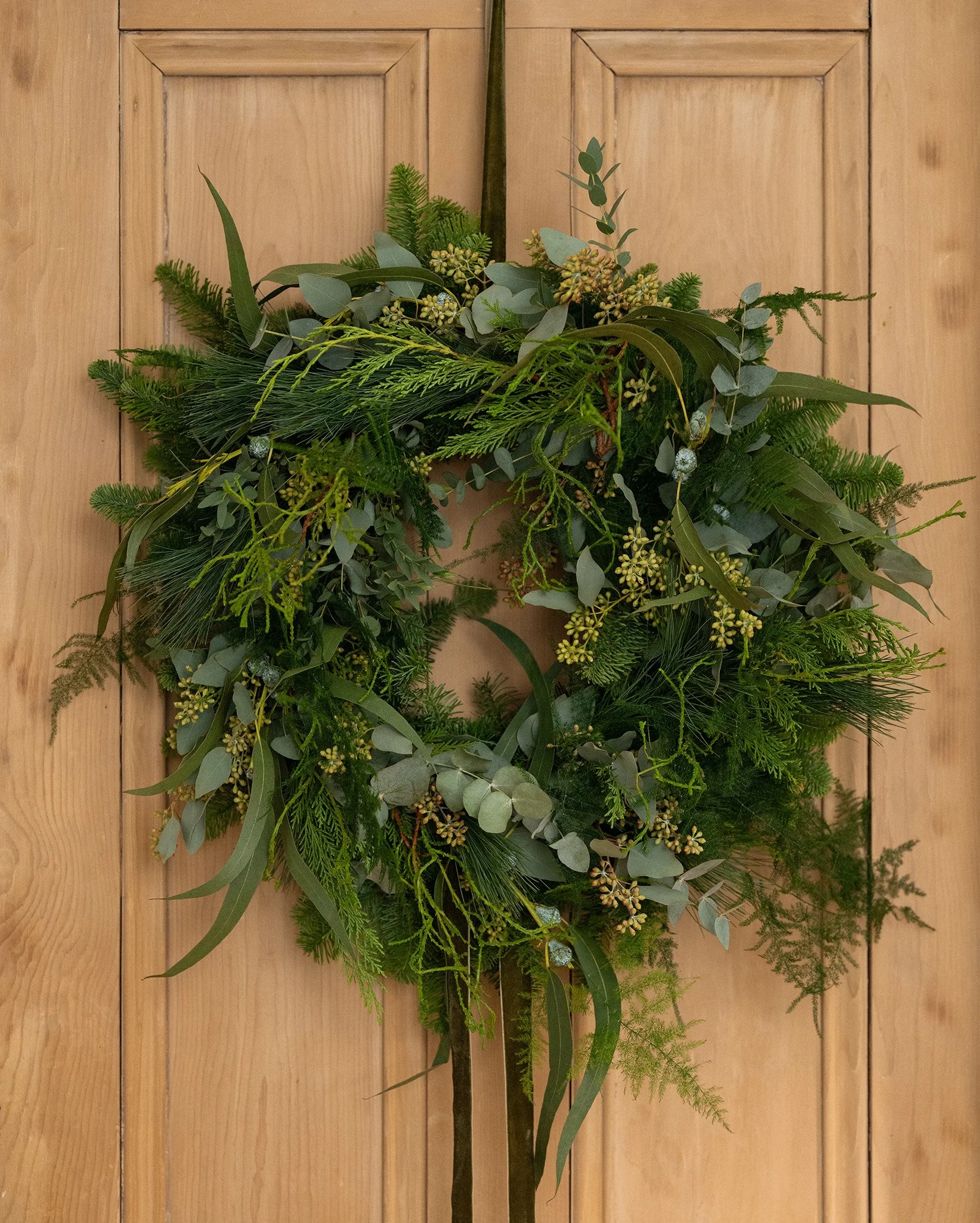 Each wreath will be created using the best of the seasons green foliage with lots of scent and texture. Expect Eucalyptus, delicate Pines, Ferns, Conifer and more Eucalyptus.